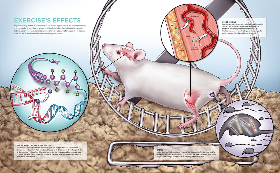 “Physical activity increases the volume of the brain’s hippocampus and improves learning and memory in mice and humans. Mouse studies have linked these effects to the growth and maturation of new neurons. Now, researchers are beginning to unravel the molecular mechanisms that connect exercise to these cognitive benefits.”